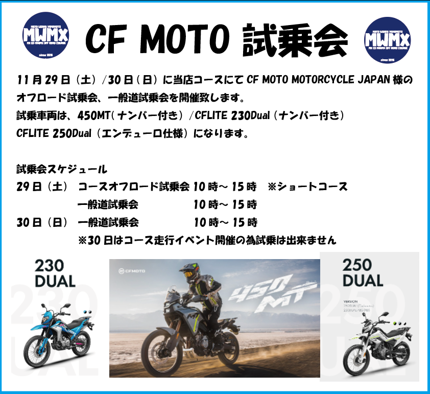 当日は、CFMOTO 450MT、CFLITE 230DUAL/250DUALの試乗車をご用意いたします。